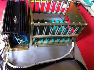 Après un démontage soigneux, j'ai repris à l'abrasif les taches de rouille de la tôle de fond et refait une protection en galvanisation à froid. J'ai bien nettoyé les cartes, l'alimentation et le rack à carte avant de les remonter partiellement sur le fond du boîtier.
